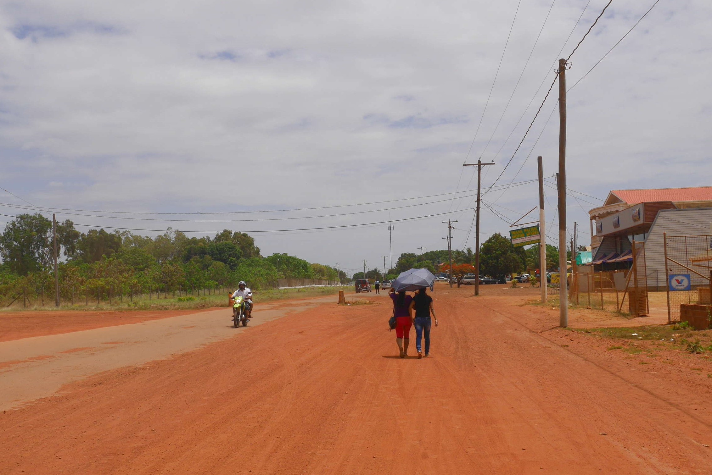 Ein echter Teufelsritt: von Fordlandia mit dem Boot nach Santarem, von Santerem mit dem Flieger nach Manaus, von Manaus 11 Stunden mit dem Bus nach Boa Vista im Norden Brasiliens, von dort mit dem Bus nach Bomfim an die Guyanische Grenze. Dort geht es wie immer schnell, unversehens lande ich im Taxi und es geht über eine neue Brücke nach Guyana: die brasilianische Passkontrolle ist (nicht selbstverständlicherweise) freundlich. Die Guyanische zieht sich ewig, Machtgehabe in Uniform gehört zum Ritus. Dann bin ich da, in Lethem, Guyana. Nicht das Französische. Das Englische, das aber ohne dieses Attribut auskommt. Sie sprechen allerdings Englisch, so eine Pidgeon-Variante.