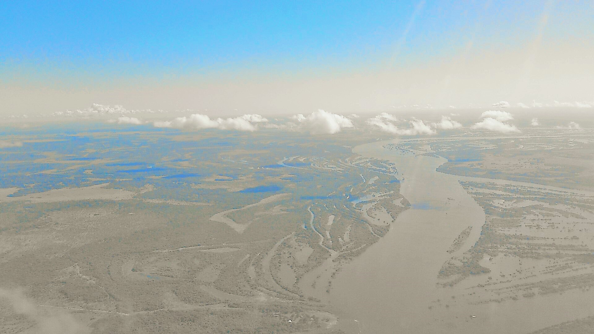Während in den Zeitungen blühende Wüsten gezeigt werden, was zugegebenermaßen auch ganz nett aussieht, sieht man beim Flug über Paraguay die wahre, die katastrophale Seite des „El Nino“. Schwer getroffen von Überschwemmungen, sind diese inzwischen Gott sei Dank wieder stark zurückgegangen.
